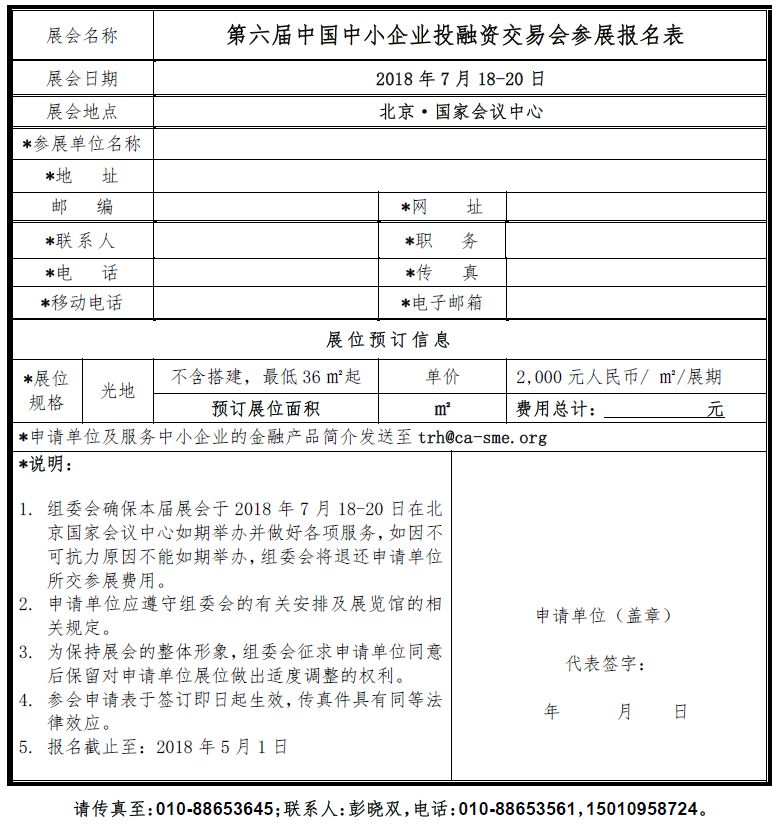 附件二:2018年第六届中国中小企业投融资交易会报名参展表